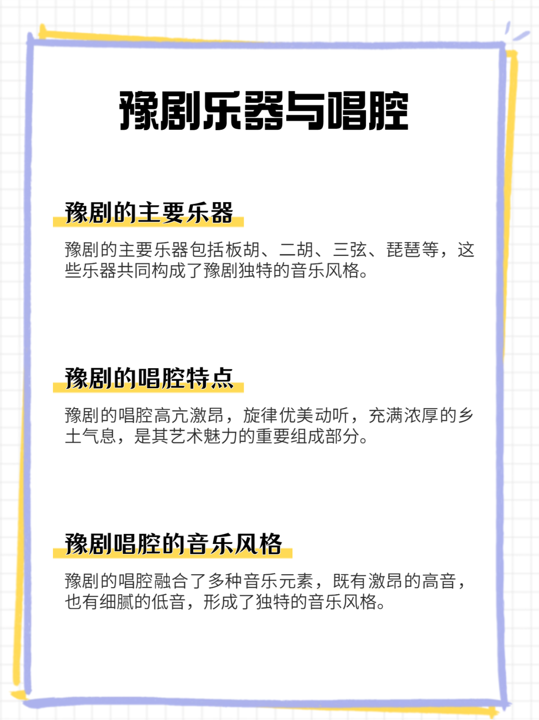 豫剧的主要乐器有板胡、二胡、三弦、琵琶等。唱腔高亢激昂,旋律优美动听,充满浓厚的乡土气息。