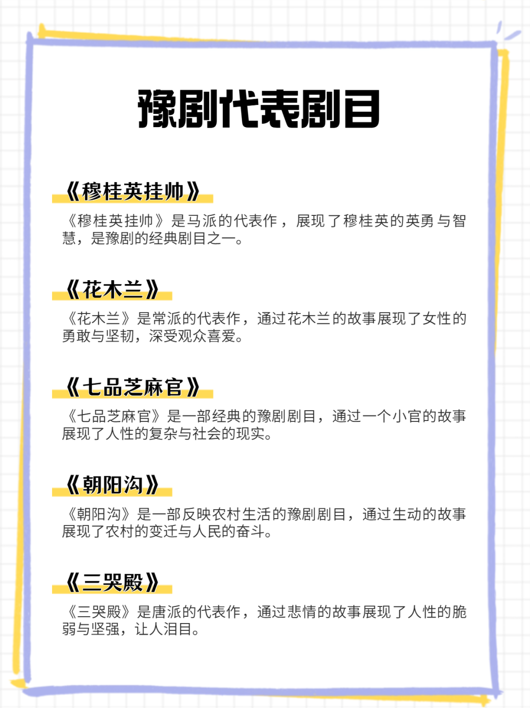 《穆桂英挂帅》、《花木兰》、《七品芝麻官》、《朝阳沟》、《三哭殿》等都是豫剧的经典剧目,每一部都值得你去品味。